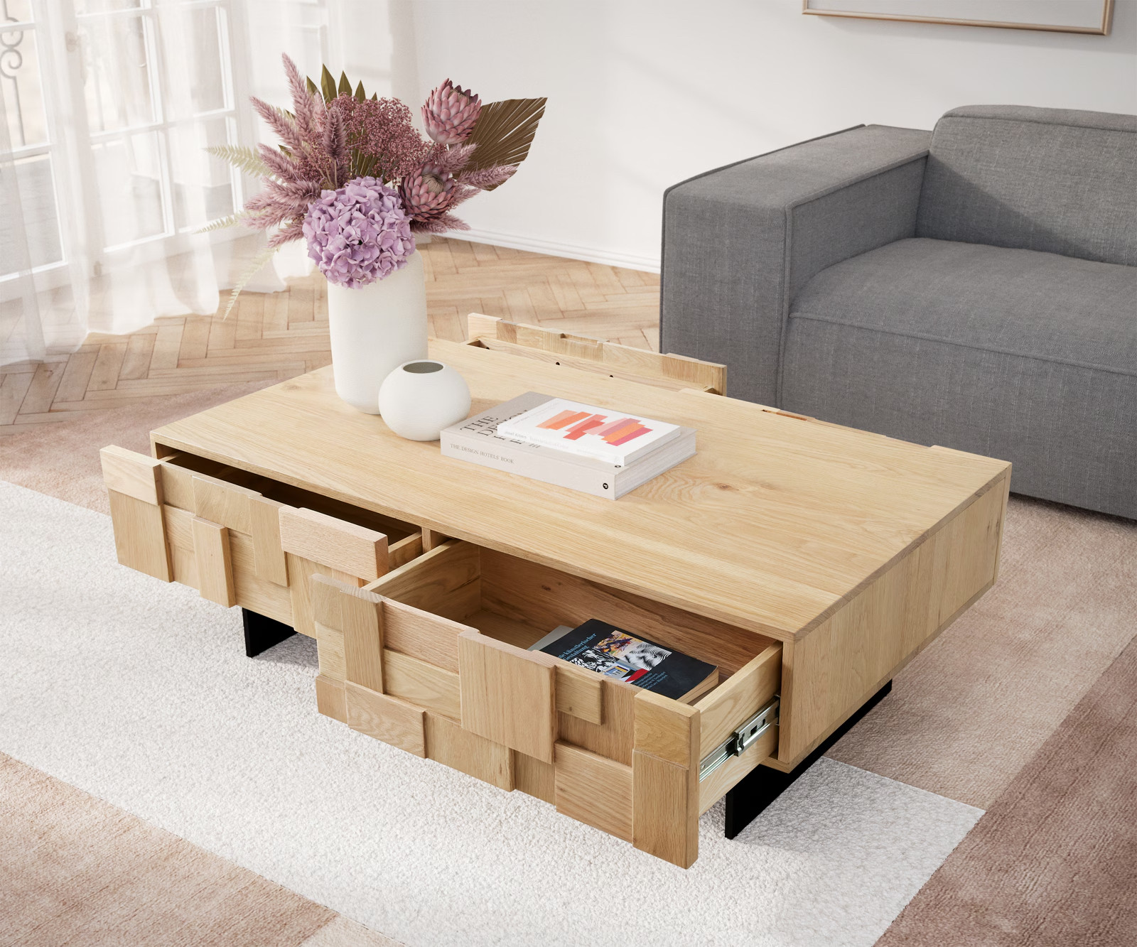 A PUZZLE dohányzóasztal lenyűgöző bútordarab. Ahogyan a kirakós játék darabjait, úgy a fiókok frontjának darabjait is nagy műgonddal, egyesével válogatva illesztik össze a legpazarabb látvány érdekében. A három dimneziós frontot különböző méretű és mélységű tölgyfa elemek alkotják. A korpuszt letisztult fekete fém lábak támasztják alá, melynek köszönhetően olyan mintha lebegne.