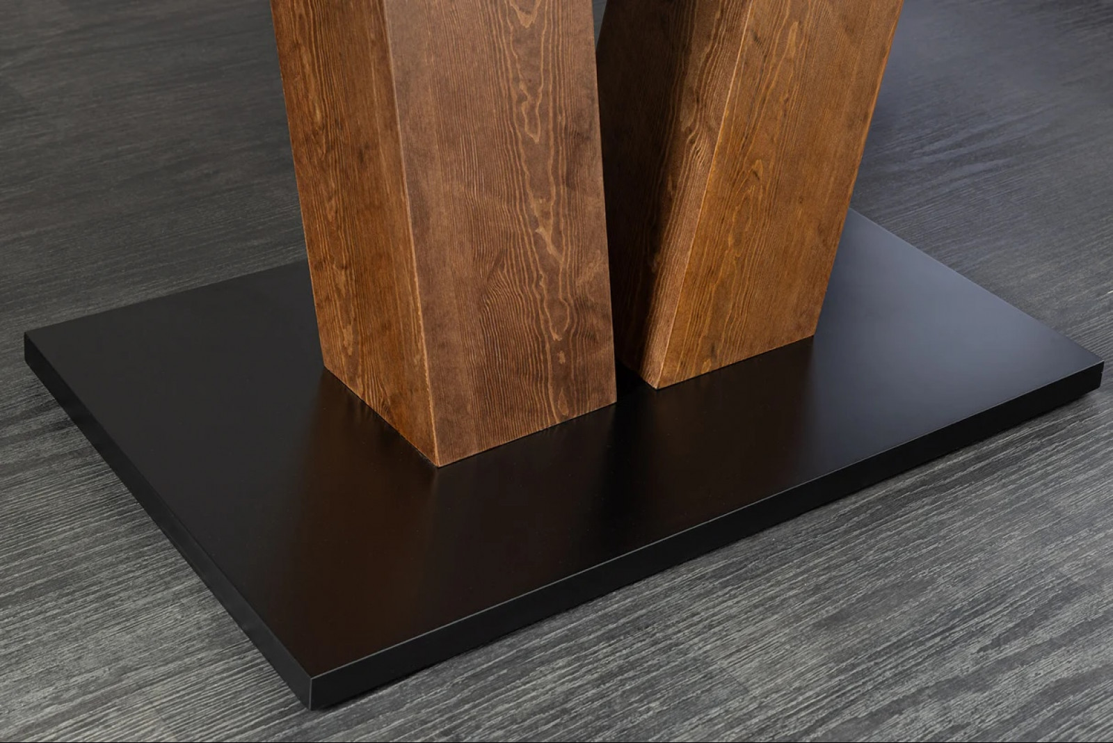 A stabilitást a jellegzetes, V alakú fekete fém lábazat biztosítja, amely látványos kontrasztként kelti életre az asztalt. A konstrukció letisztult arányai és masszív kialakítása garantálják, hogy ne csak dekoráció, de hosszú életű használati tárgy is legyen.