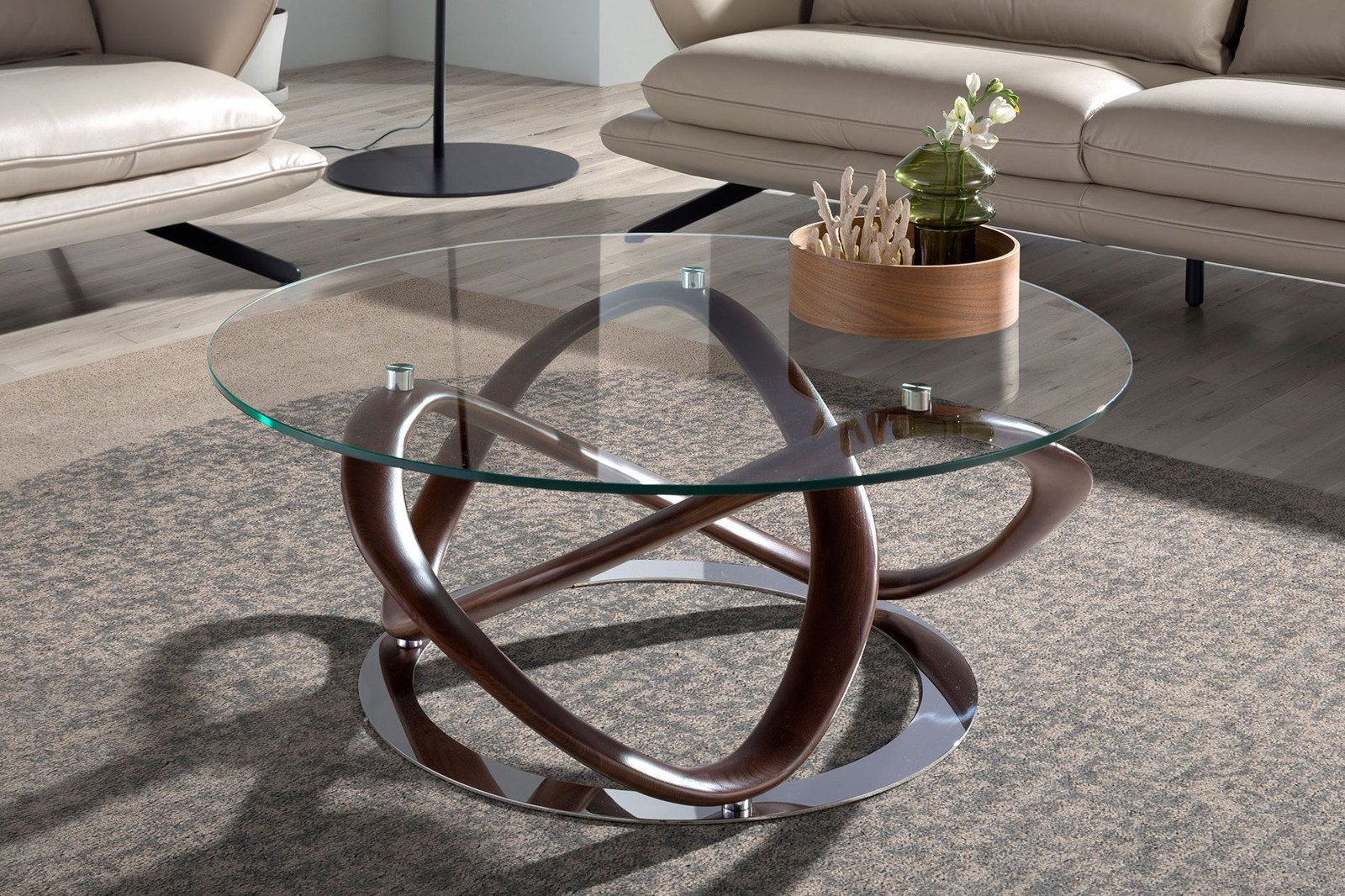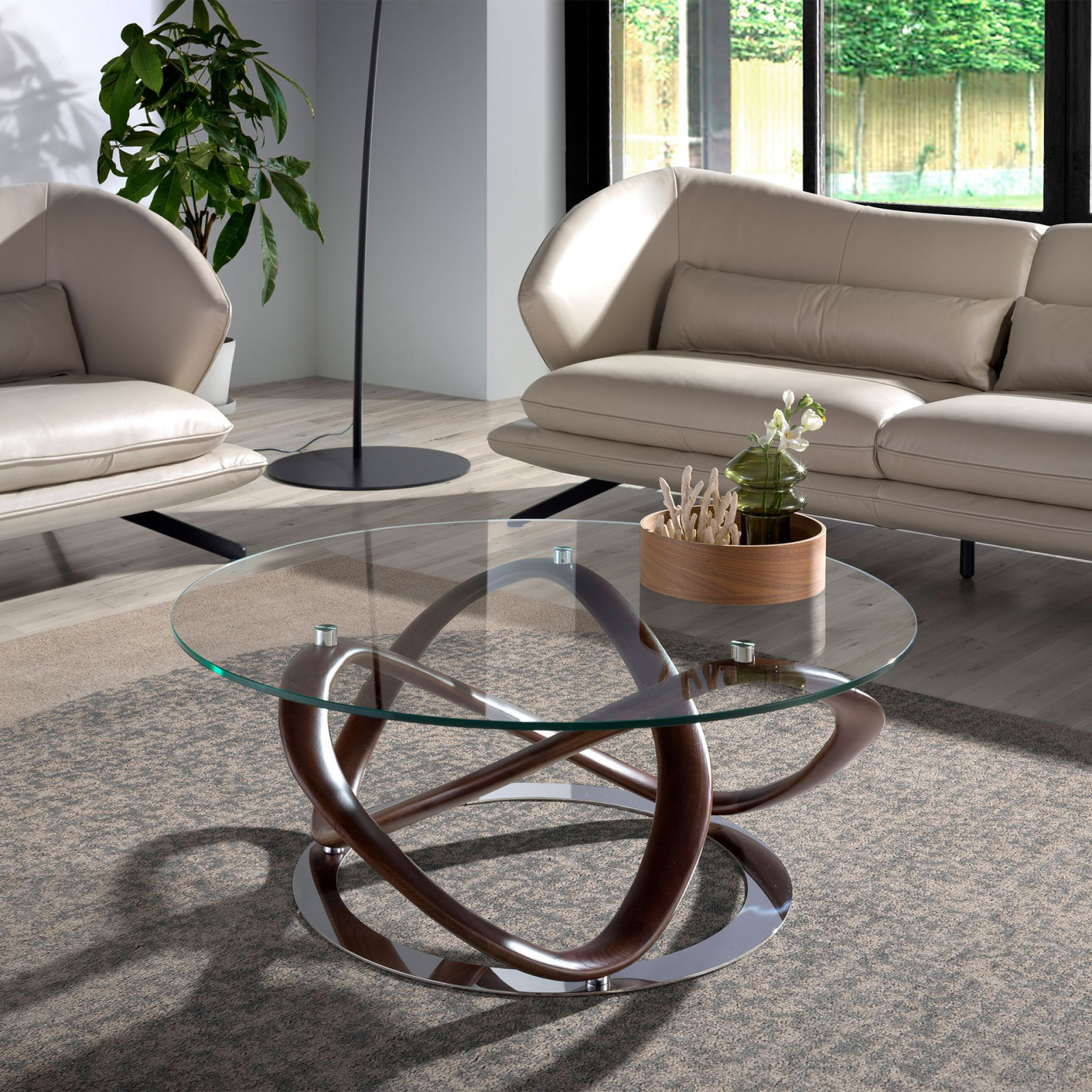 A RHIZOMA dohányzóasztal egy valódi kortárs műremek. Az ámulatba ejtő hajlított bükkfából készült központi elem pazar látványt nyújt. A légies üveglap tovább hangsúlyozza a mesés látványt, melyet minden irányból megcsodálhatunk. Krómozott acél gyűrű fokozza a bútor exkluzivitását.