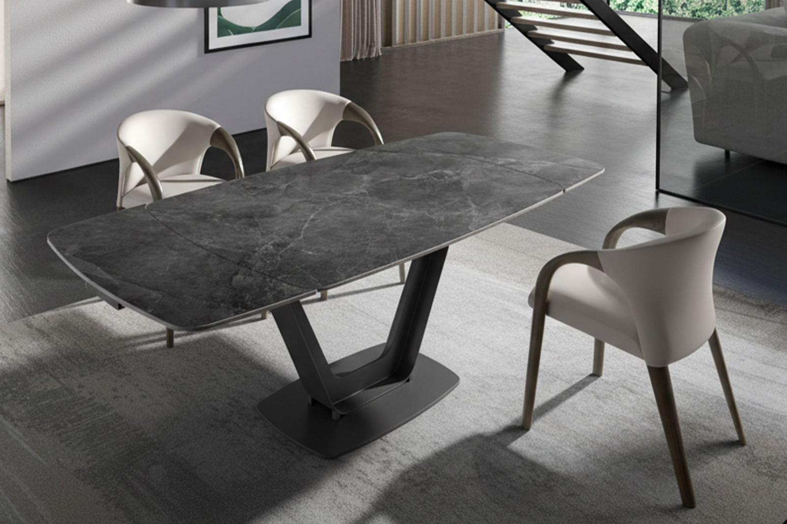 A RODELLAR kerámia lapos étkezőasztal fiatalos és trendi megjelenésű. A fekete, márvány mintázatú kerámia asztallap modern eleganciát sugároz, melyet az epoxy festéssel ellátott rozsdamentes acél lábak tesznek teljessé. Különleges megjelenését a bővítő mechanizmus kialakításának köszönheti.
