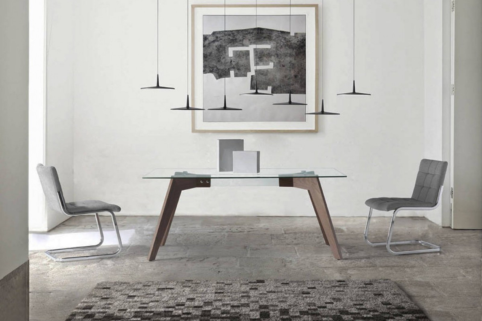A ROGER étkezőasztal modern és fiatalos. Az egyszerű vonalvezetésű asztal lábait diófa furnérral látták el a tervezők, lapja pedig biztonsági üvegből készült. Különlegessé teszi az asztalt a lábak izgalmas kialakítása és az asztallap alatt futó merőleges hosszanti üveglap.