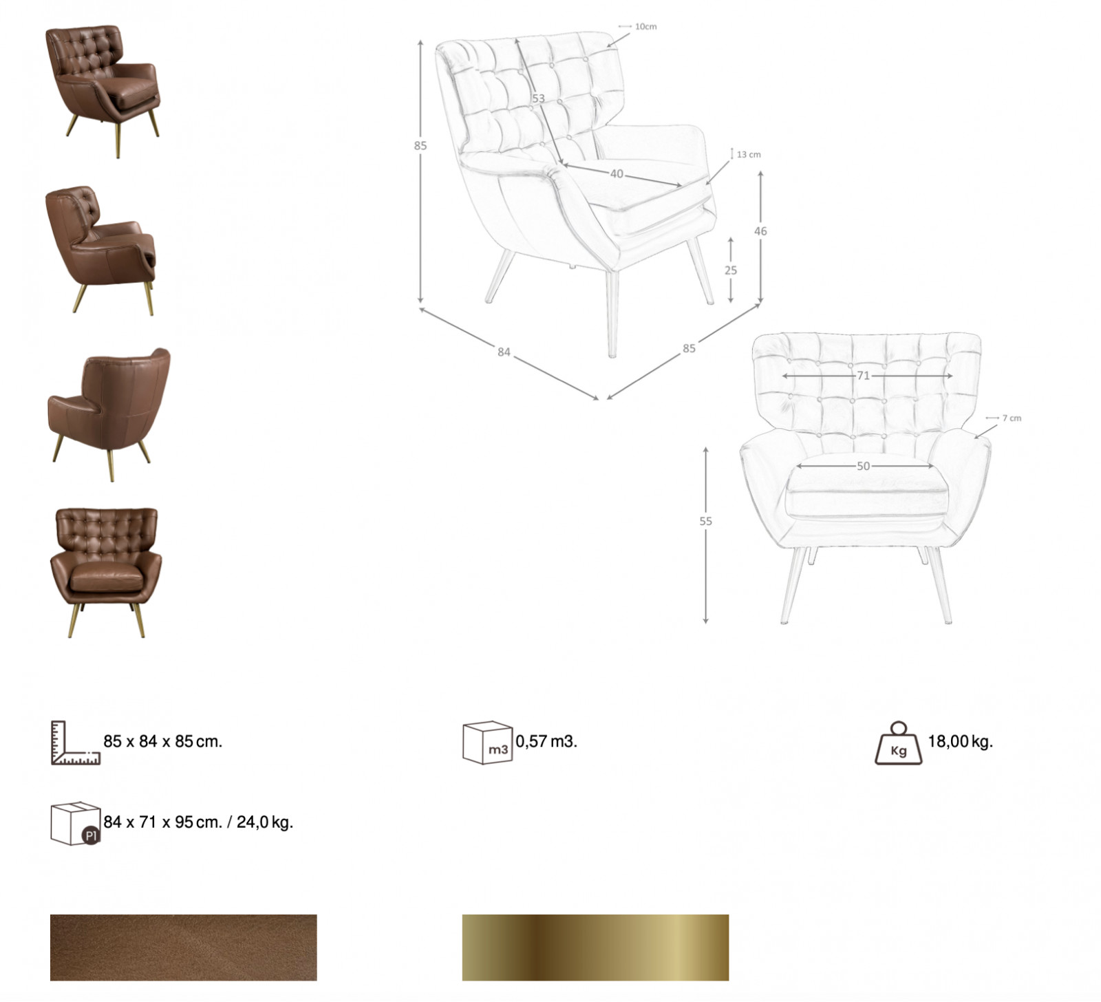 A lekerekített háttámla és az ülőfelület arányai kiváló kényelmet nyújtanak, miközben a fotel önmagában is hangsúlyos jelenlétet teremt egy elegáns nappaliban, könyvtárszobában vagy dolgozószobában. Az arany színű fém lábak modern kontrasztot képeznek a bőrrel, fiatalosan emelve ki a forma karakterét.