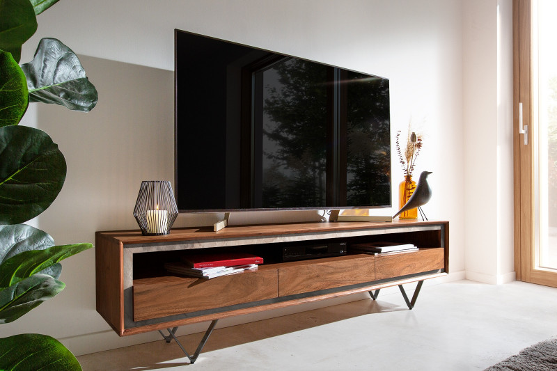 A STONEGRACE TV-szekrény lenyűgöző bútordarab. A csodás mintázatú akácfából készült szekrény letisztult, minimalista frontját világos kőfurnér szegélyezi, megtörve ezáltal a monotonitást. A bútort látványos V-alakú porfestett acél lábak támasztják alá.