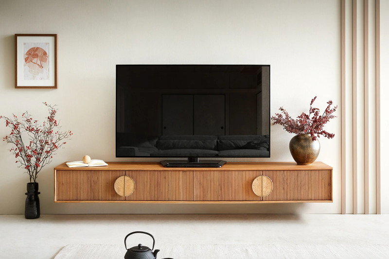 A SURIMU TV-szekrény a japandi stílusirányzat lenyűgöző darabja. A csodás mintázatú akácfából készült szekrény frontja függőleges bemarásokkal díszített, a különleges réz fogantyúk helyezik fel a koronát a megjelenésére. A természetes fa harmóniája sugárzik a bútorból. Falra függeszthető kivitel.