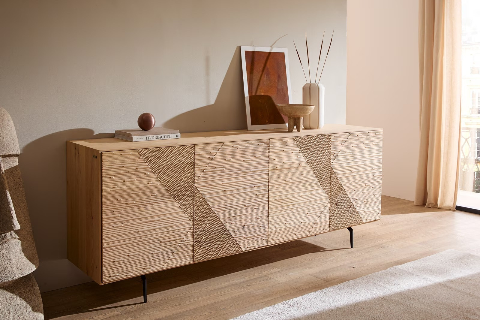 A TEREOS komód a modern elegancia és a természetes erő találkozása. A bútor korpusza csodás mintázatú kőrisfából készült, amelyet különleges, háromdimenziós mintázattal formáltak meg – ez a plasztikus felület minden fényben más és más karaktert mutat, így a bútor valódi látványelemként uralja a teret. A markáns, fekete fém lábak légies könnyedséget adnak a masszív testnek, miközben stabil tartást biztosítanak. A négy ajtó mögött rejlő tágas rekeszek gondoskodnak a rendezettségről, így a bútor egyszerre funkcionális és dekoratív.