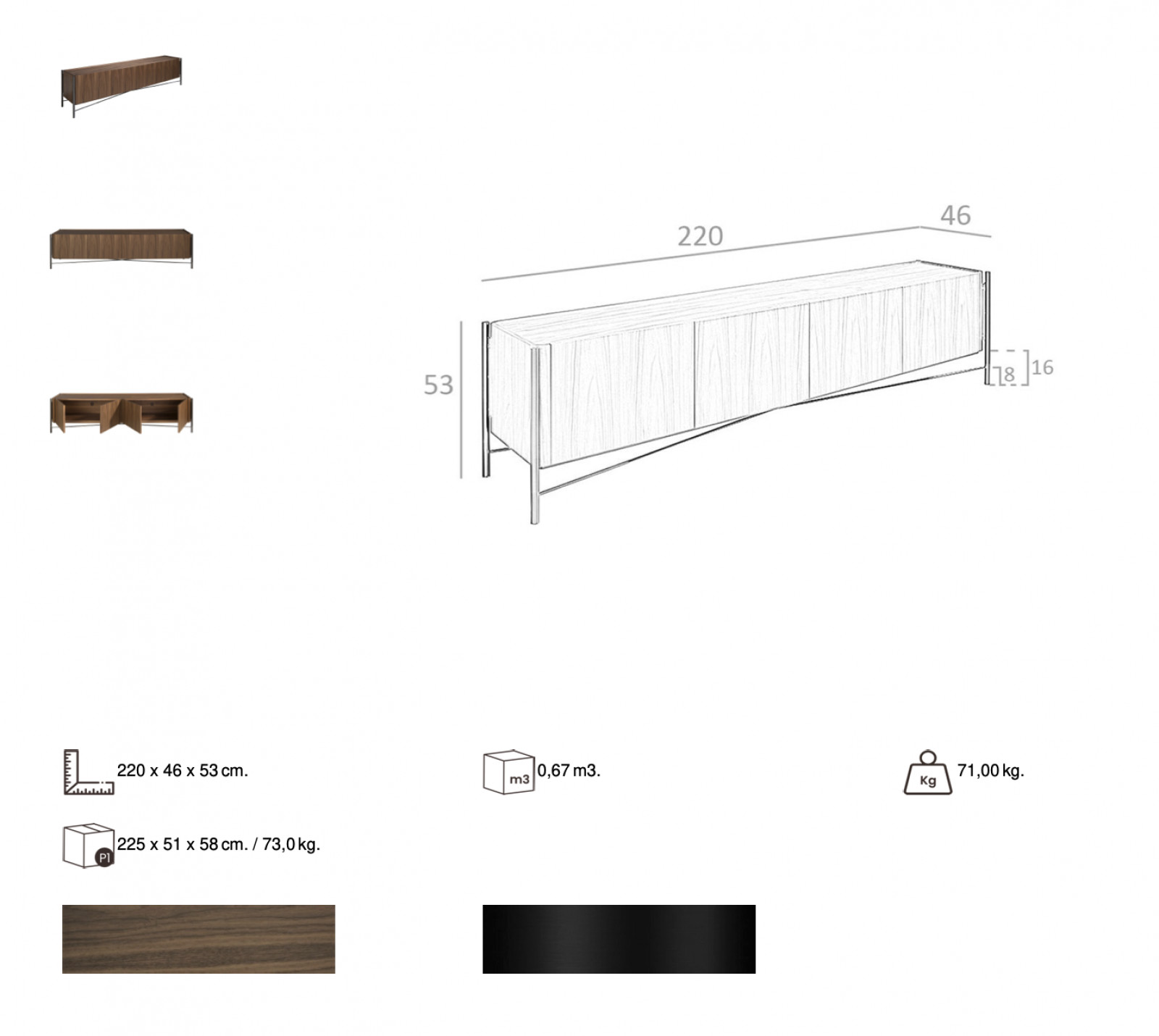 A TERUEL TV-szekrény a kortárs design csodás darabja. A gyönyörű diófával furnérozott korpusz minimalista vonalai eleganciát kölcsönöznek a bútordarabnak. A letisztult rozsdamentes acél lábak teszik igazán stílusossá megjelenését. A spanyol designerek tervezte bútoron azonnal szembetűnik a minőségi megmunkálás és anyaghasználat.