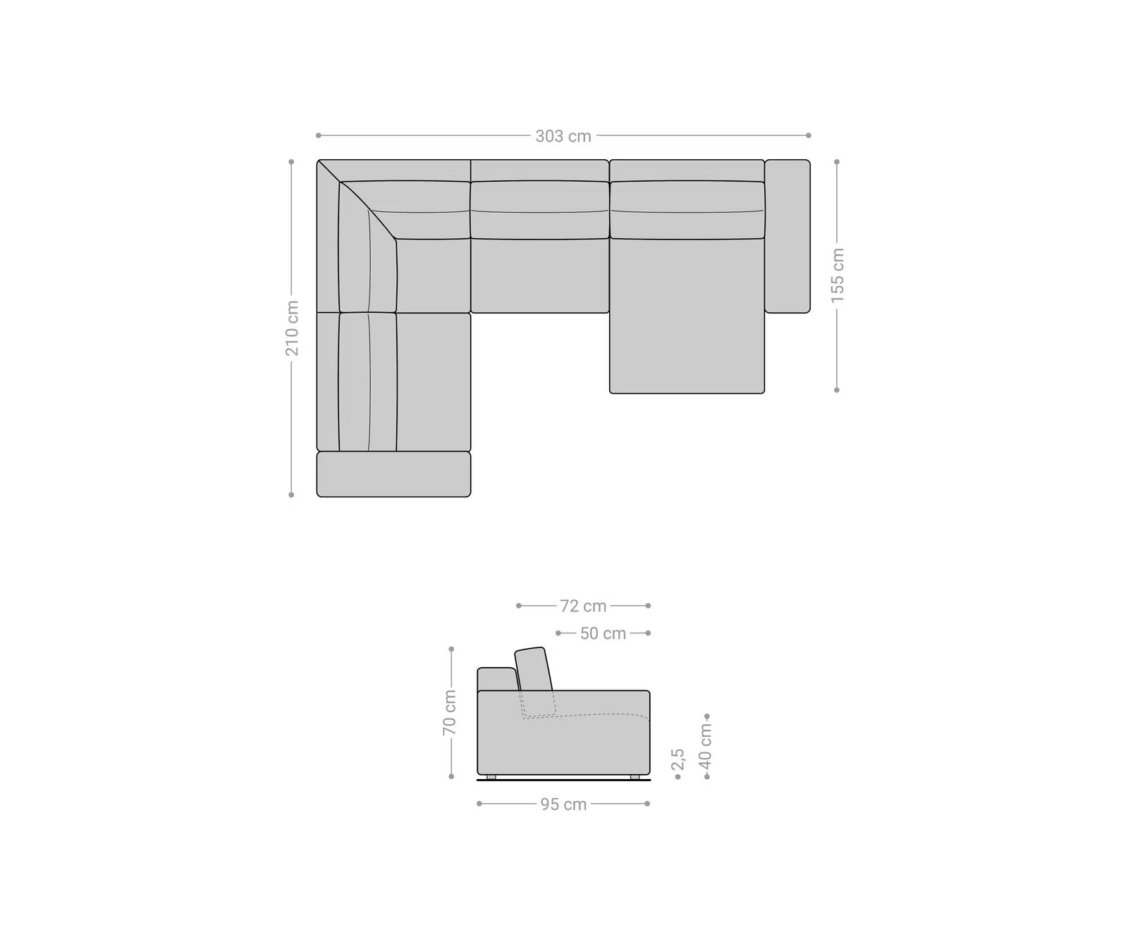 Méret: 303cm x 210cm x 70cm (hosszúság x szélesség x magasság)