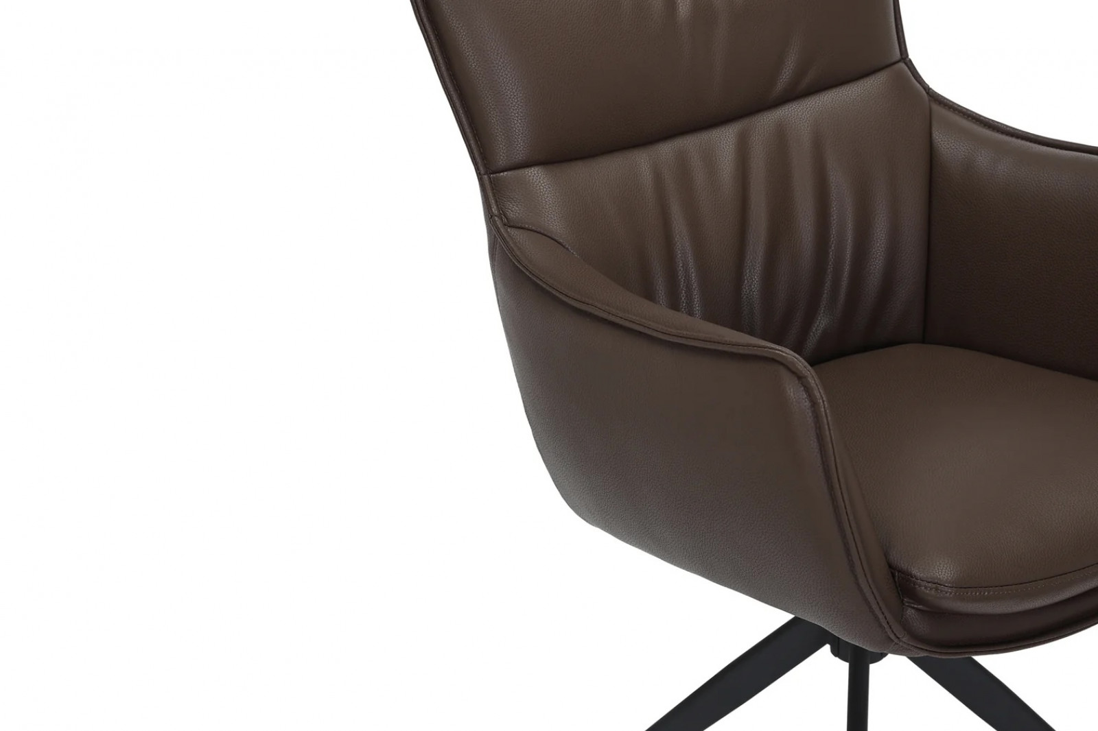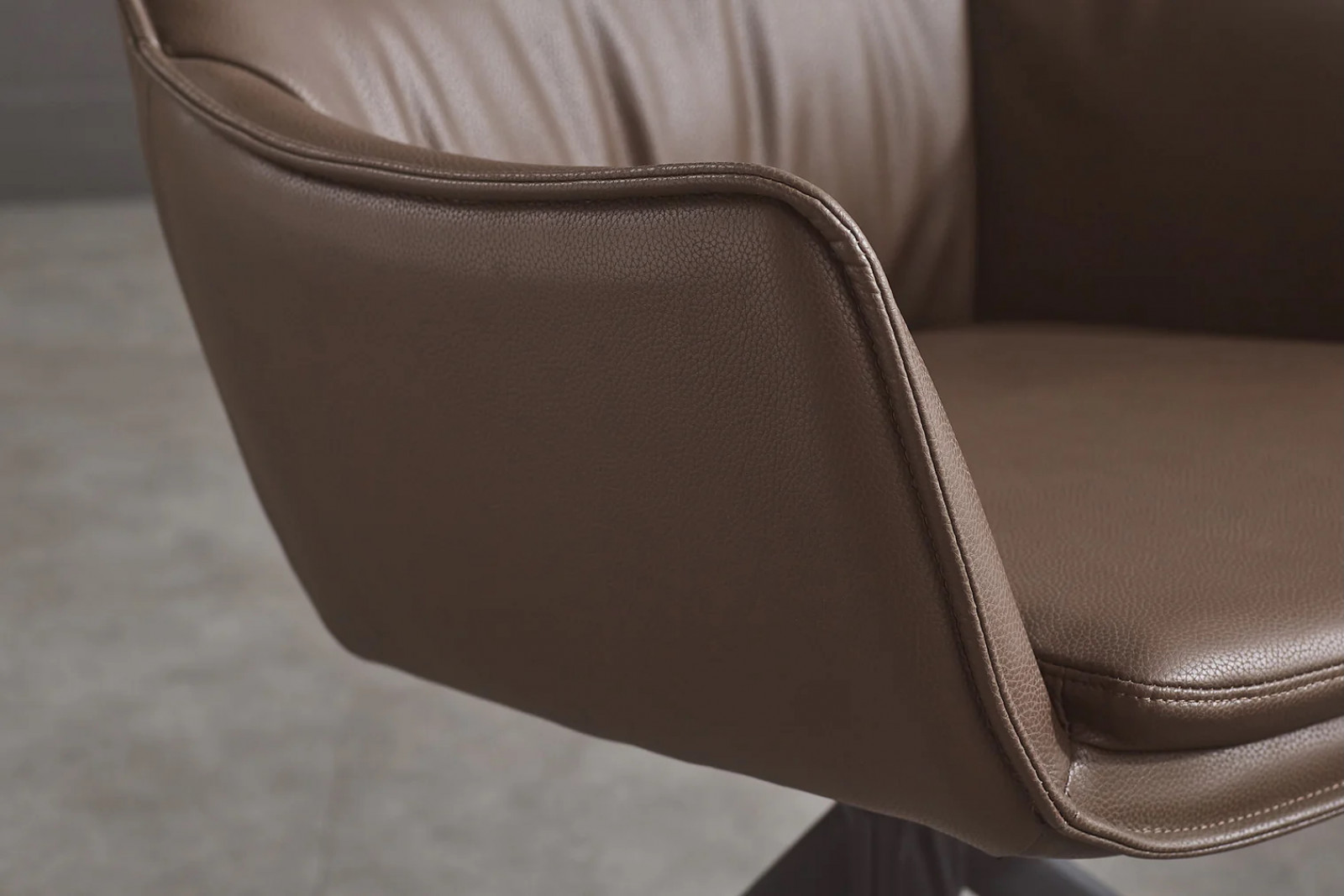A VOGUE szék modern, kortárs kialakítása nemcsak mutatós, de rendkívül kényelmes is. A magas minőségű, szintetikus bőrrel borított, vastagon párnázott ülőfelületet varrásokkal díszítették a tervezők. A szék komfortját tovább fokozza, hogy 360 fokban fordítható, ezáltal megkönnyíti az asztal mellőli felállást. Masszív, porfestett acél lábak gondoskodnak a stabilitásról.